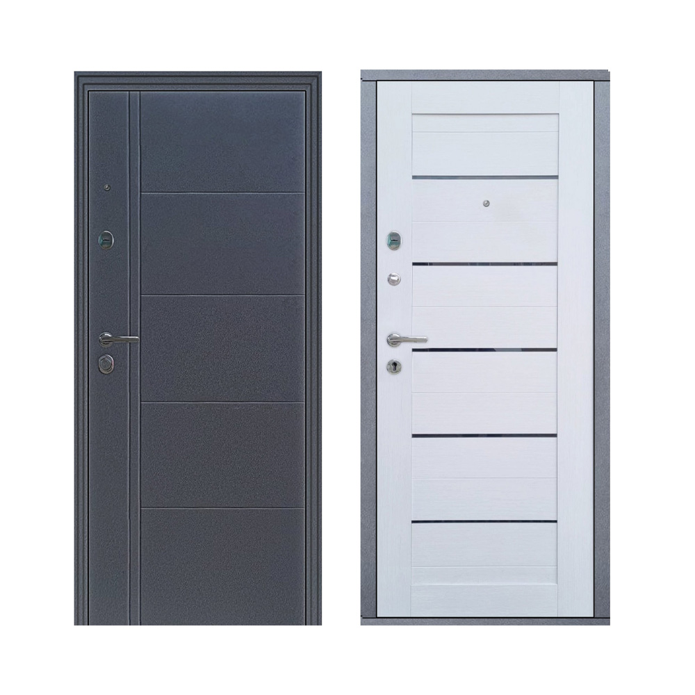 Ușă de intrare modernă și fiabilă M-77, în nuanță elegantă antracit-alb — o alegere excelentă pentru case și apartamente unde se apreciază siguranța, izolația termică și un design contemporan.